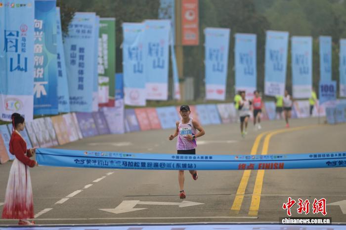 图为A504号选脚弛廷到达止境,并以2小时40分36秒获东坡马推紧男子组第别名。中新社记者 刘忠俏 摄